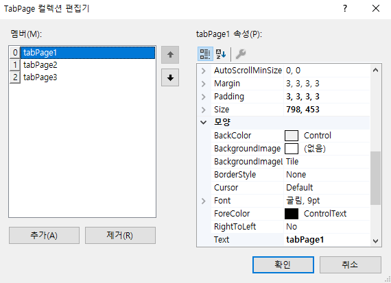 TabPages : 아래 그림 참고(예제로 Page3개의 TabControl을 생성)