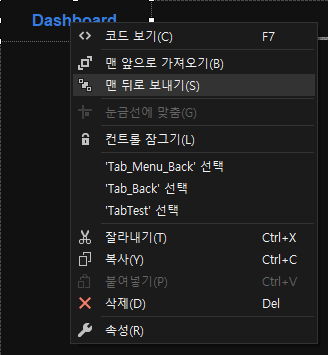 TabControl 선택 -> 마우스 오른쪽 클릭 -> 맨 뒤로 보내기