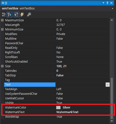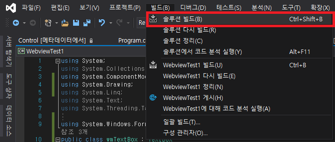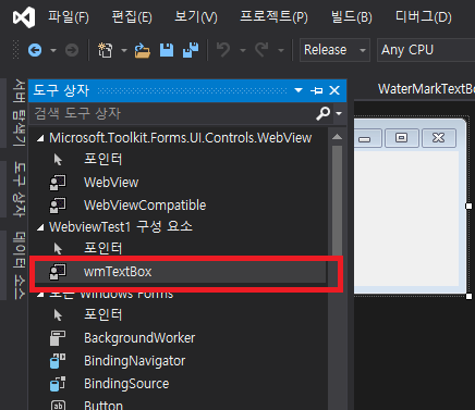 [솔루션 빌드] 이후 [도구 상자]에서 생성된 wmTextBox를 Form에 추가한다.