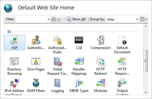 IIS 관리자를 사용하여 이러한 설정을 구성 할 수 있습니다. 이렇게하려면 IIS 관리자를 열고 스크립트 메시지를 사용하거나 사용하지 않도록 설정할 사이트 또는 응용 프로그램으로 이동 한 다음 ASP 기능 을 두 번 클릭합니다 .