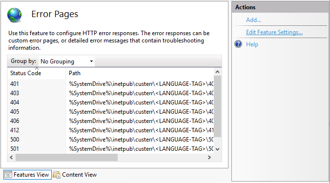 에러 페이지(Error Pages) 우측 작업(Actions) 목록에서 기능 설정 편집(Edit Feature Settings...) 기능을 클릭합니다.