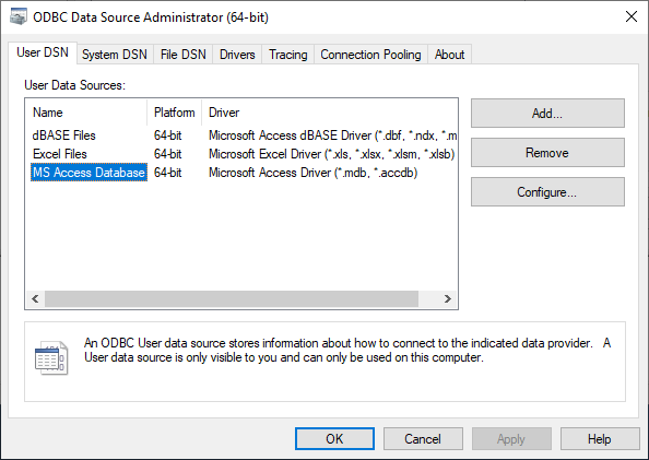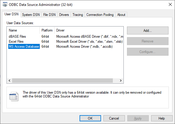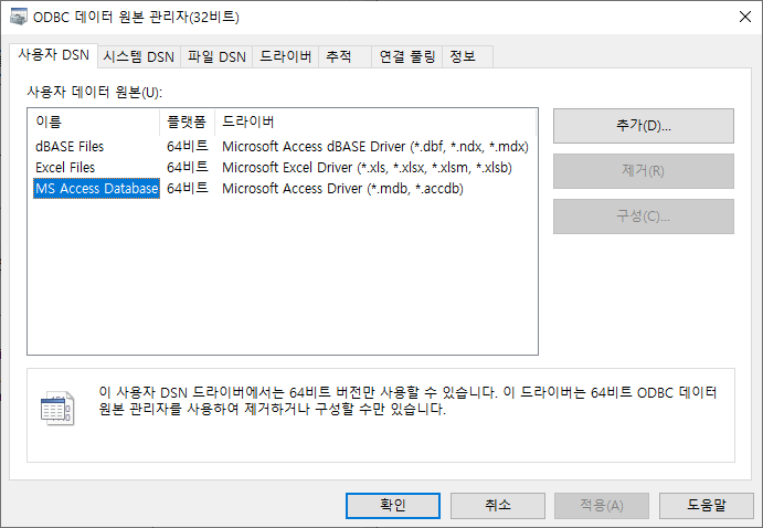 64비트 환경이라면 ODBC 데이터 원본 관리자 (64비트) 를 통해 추가(Add) 하십시요.
