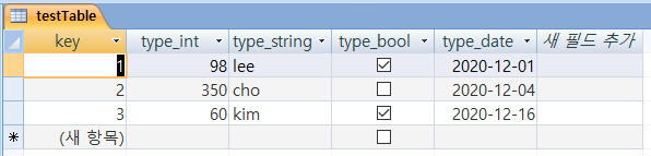 Table은 가장 많이 사용하는 Data 형식 5개로 테스트 합니다.